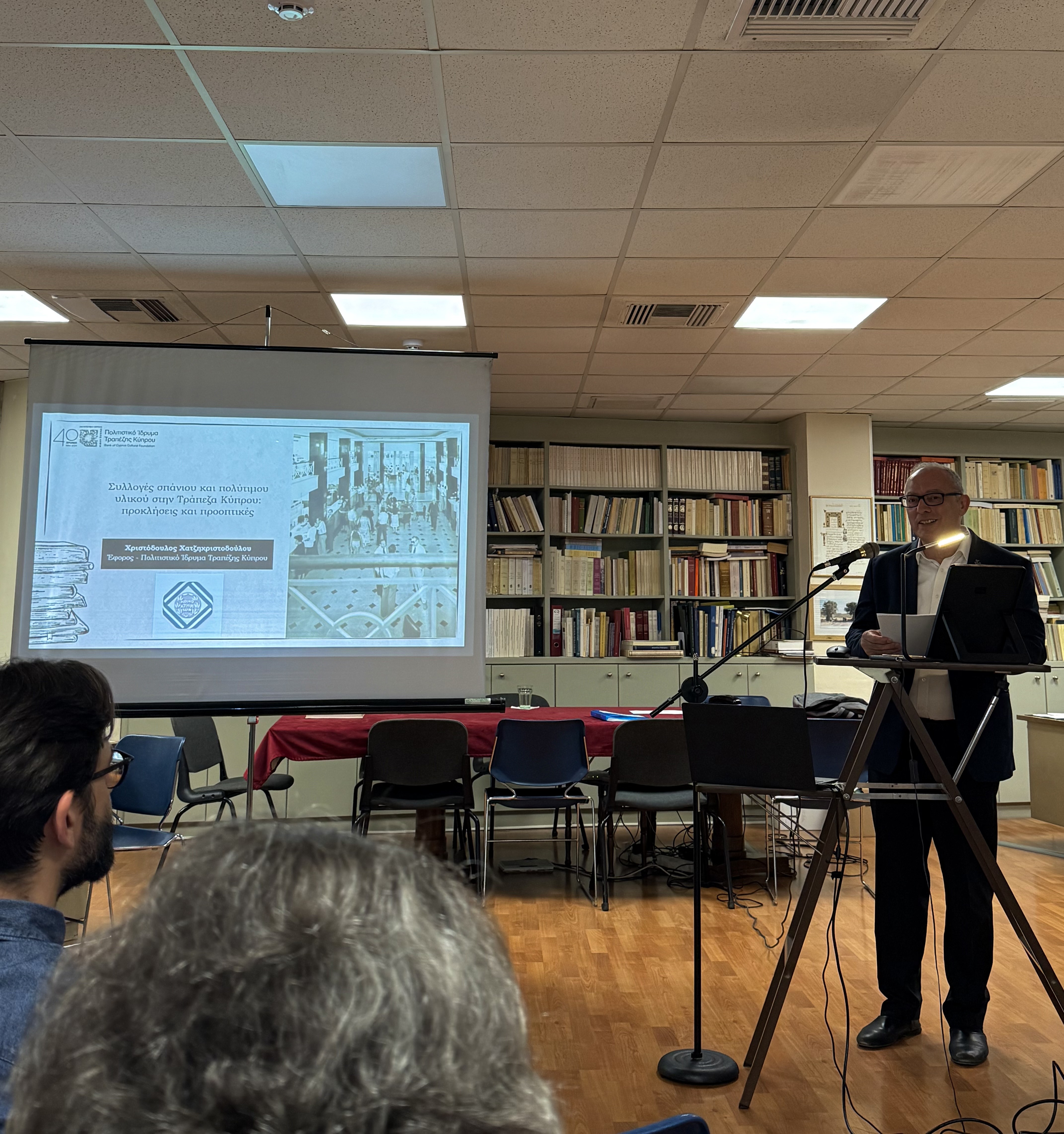 In the framework of the lecture series "Historical Bank Archives" of the Center for History and Palaeography (CHP) of MIET, the 5th lecture entitled "Collections of rare and valuable material in the Historical Archive of the Bank of Cyprus: challenges and perspectives" was successfully held. The Curator of the Bank of Cyprus Cultural Foundation, Dr. Christodoulos Hadjichristodoulou, was invited to present the work and collections of the Bank of Cyprus Historical Archives.