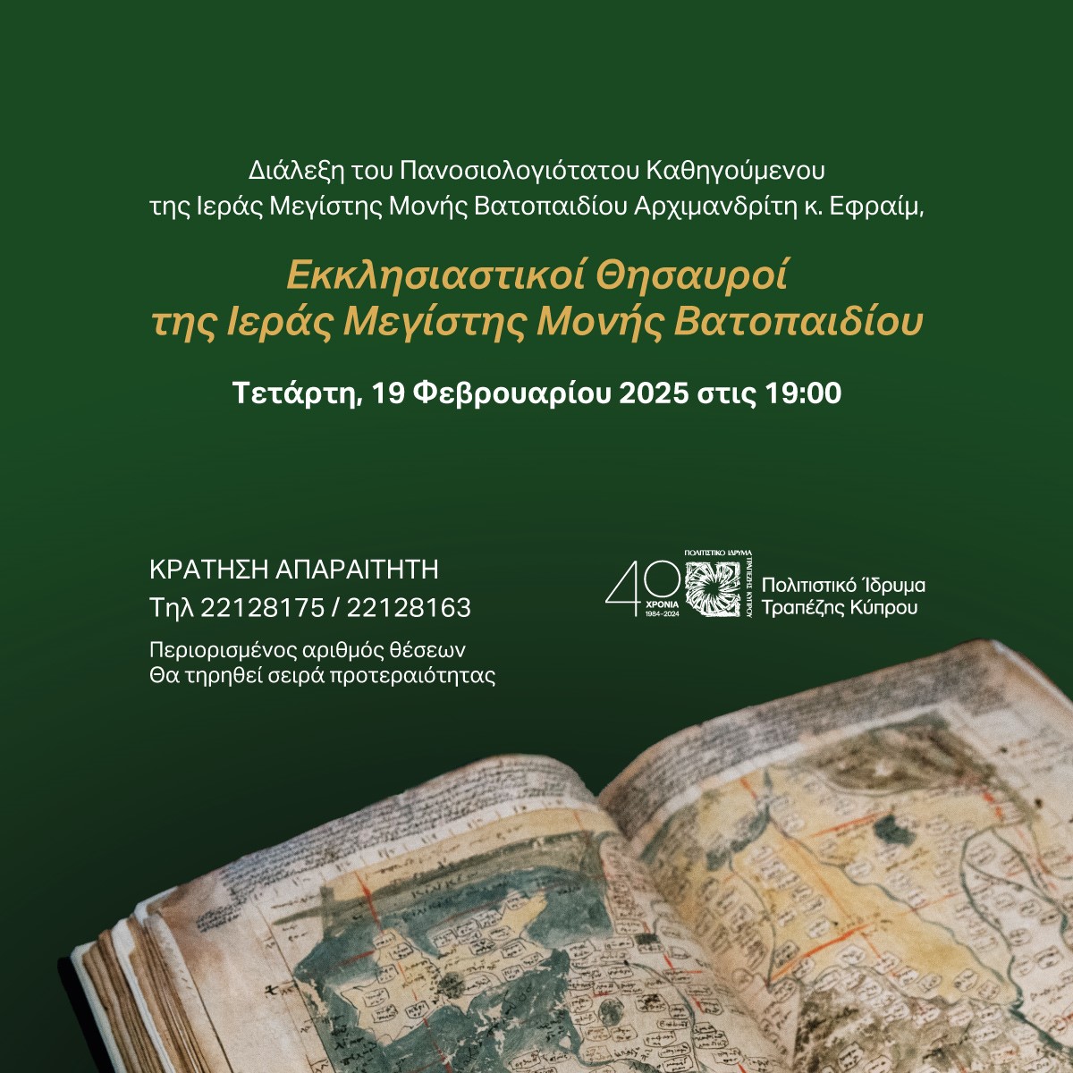Στο πλαίσιο της έκθεσης  «Κύπρος Νήσος»  Ιστορία-Μνήμη-Πραγματικότητα, το Πολιτιστικό Ίδρυμα Τραπέζης Κύπρου διοργανώνει τη διάλεξη του πανοσιολογιότατου καθηγούμενου της Ιεράς Μεγίστης Μονής Βατοπαιδίου Αρχιμανδρίτη κ. Εφραίμ  με θέμα «Εκκλησιαστικοί θησαυροί της Ιεράς Μεγίστης Μονής Βατοπαιδίου».