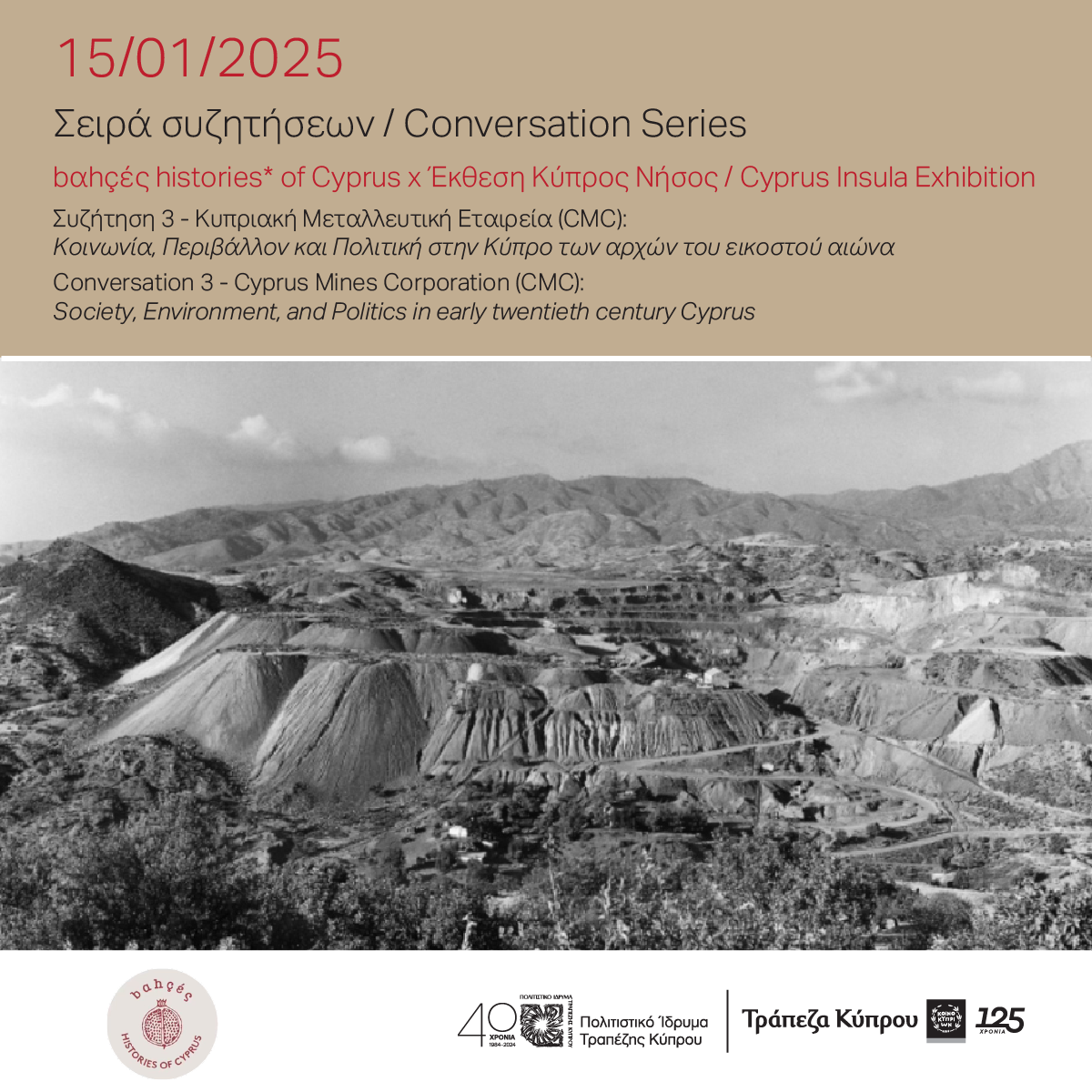 The Bank of Cyprus Cultural Foundation in collaboration with the bahçes histories* of Cyprus, invites you to the third and final part of this discussion series, entitled Cyprus Mines Corporation (CMC): Society, Environment, and Politics in early twentieth century Cyprus on Wednesday 15/1/2025.
