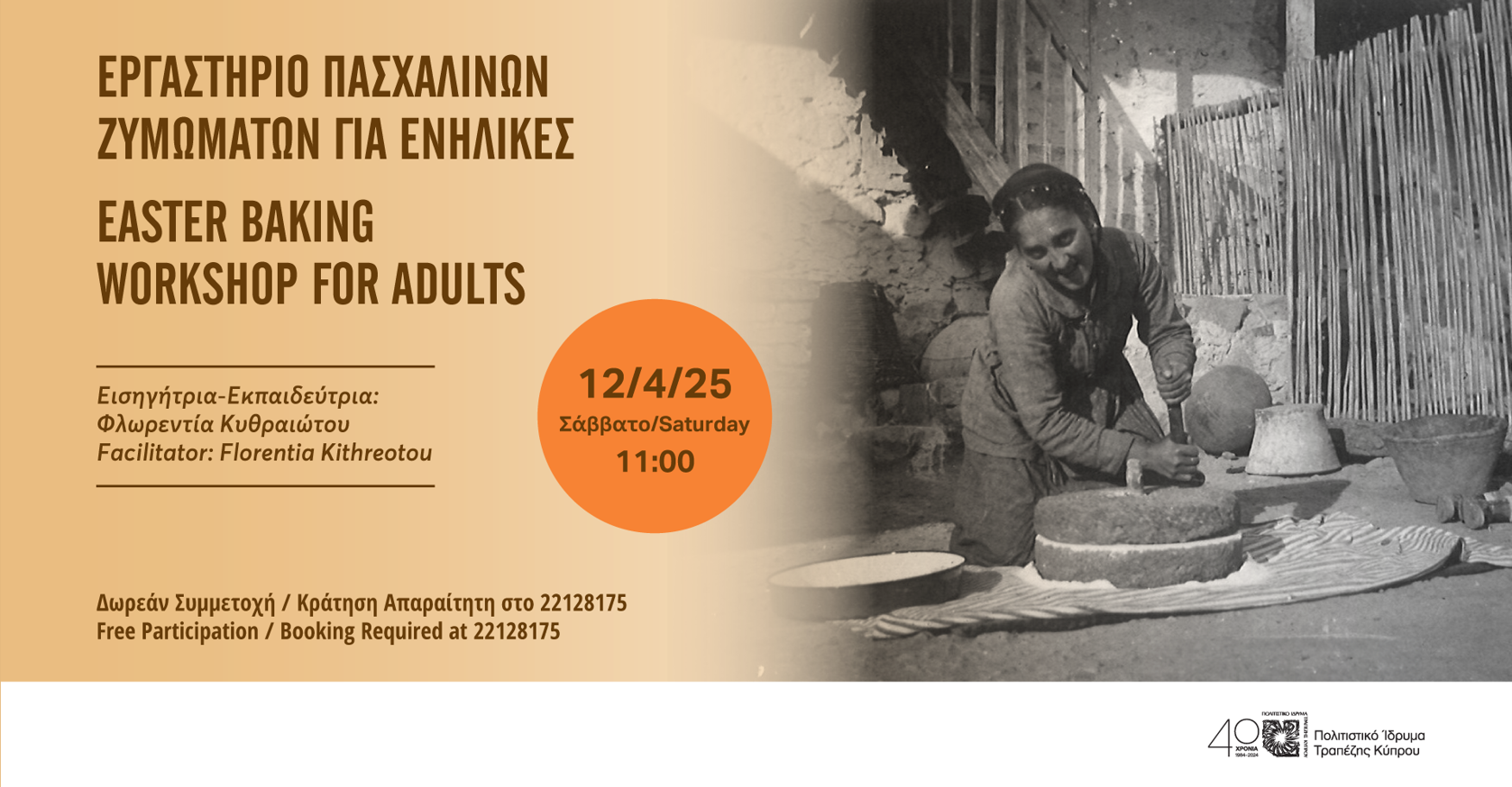 The Bank of Cyprus Cultural Foundation in collaboration with the author and educator Florentia Kythreotou invites you to the first baking workshop for adults of this trilogy, dedicated to the traditional Easter breads of Cyprus.